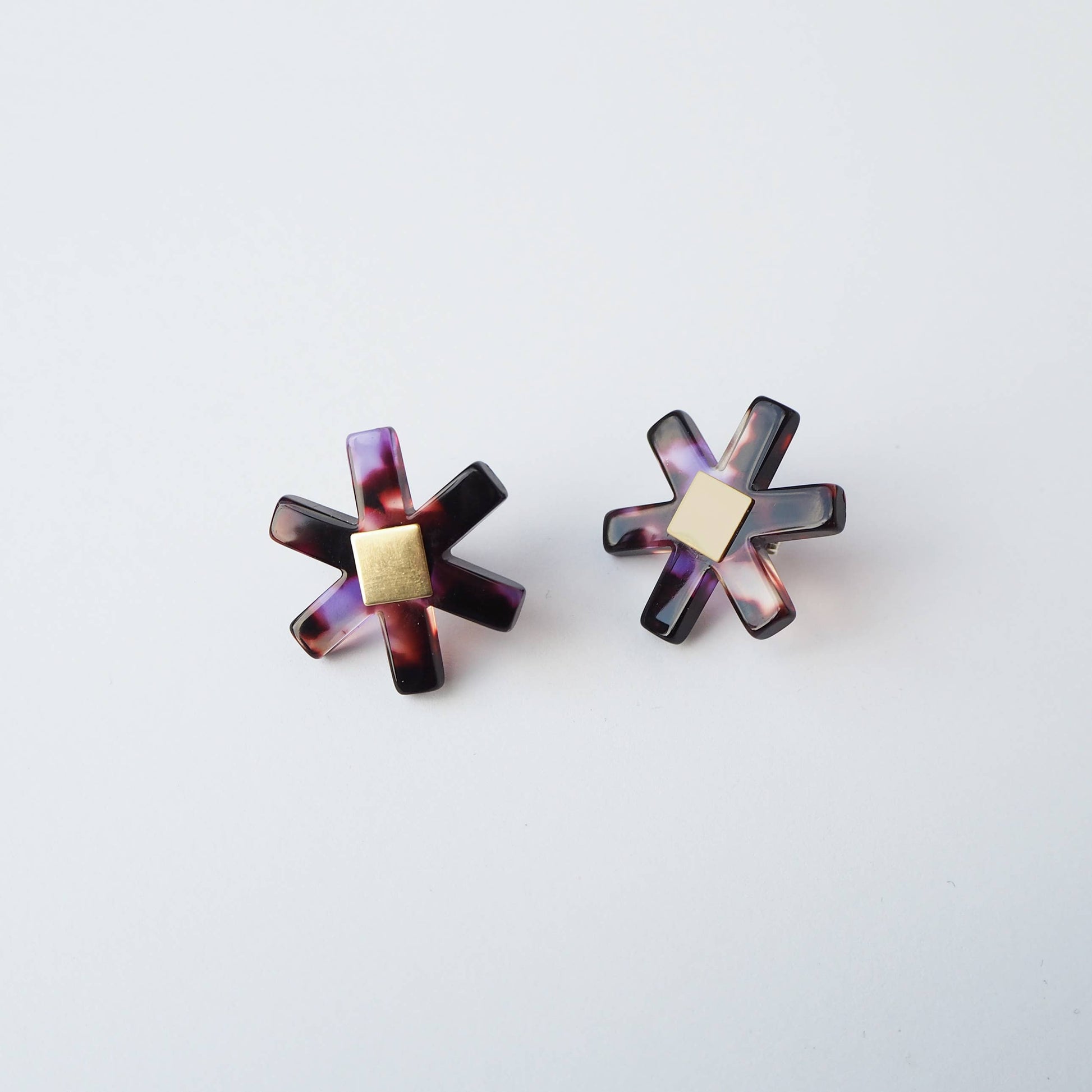 Dark tortoiseshell and violet flower shaped stud earrings.
