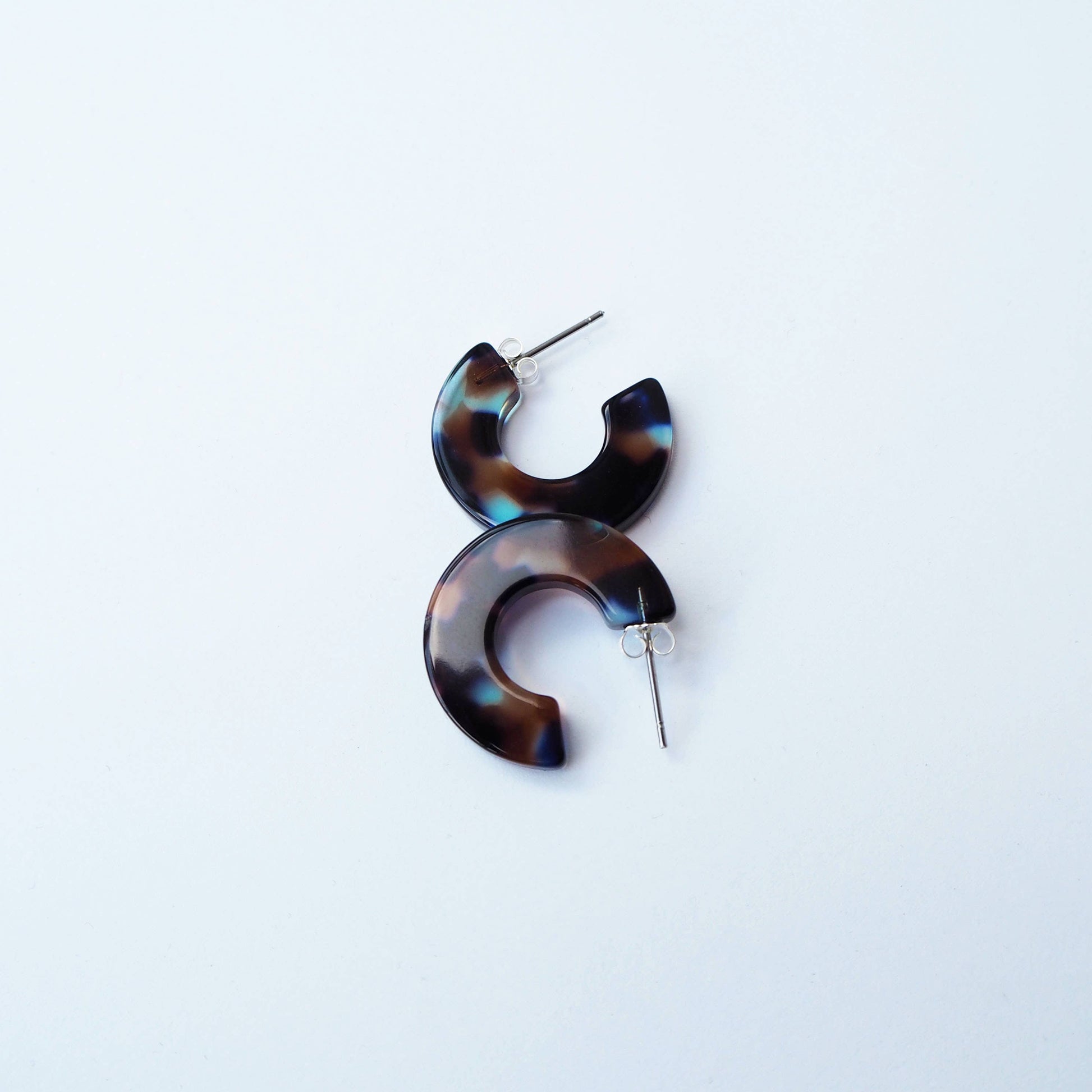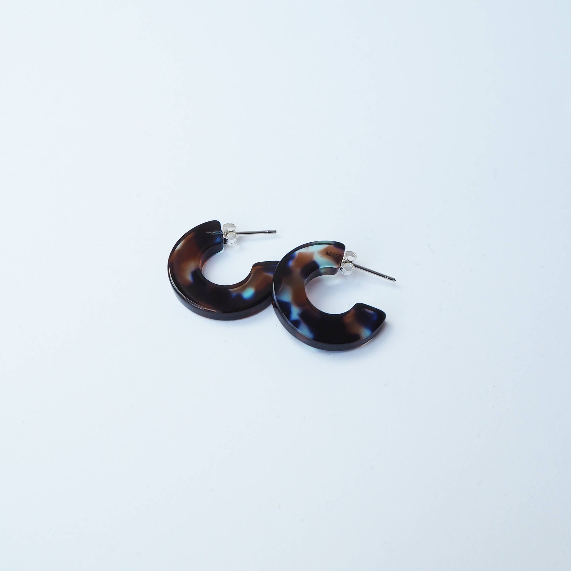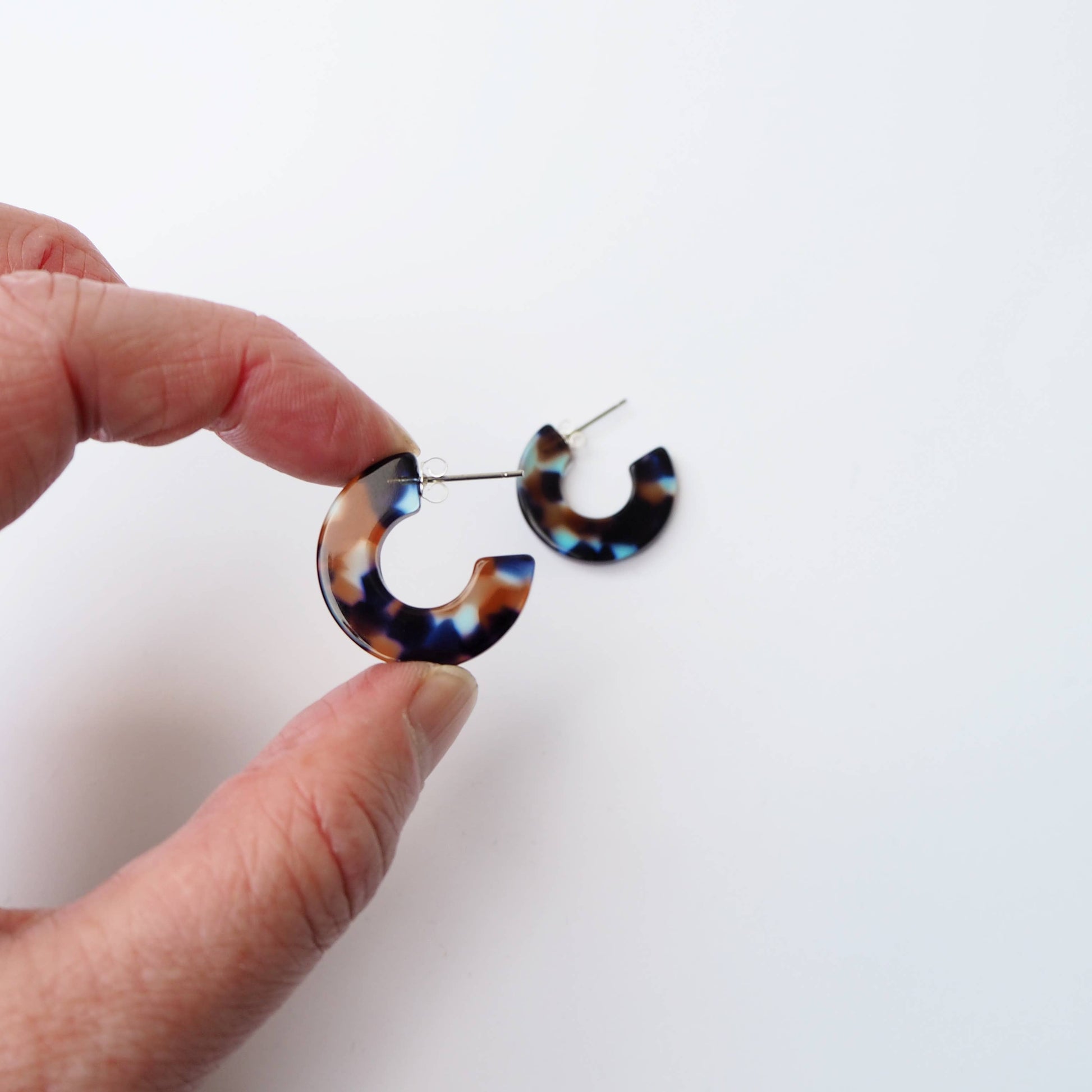 These beautiful mini hoop earrings are made from hand polished petroleum free cellulose acetate in a beautiful acid tortoiseshell mix which has a glass like finish. The perfect hoop earring.