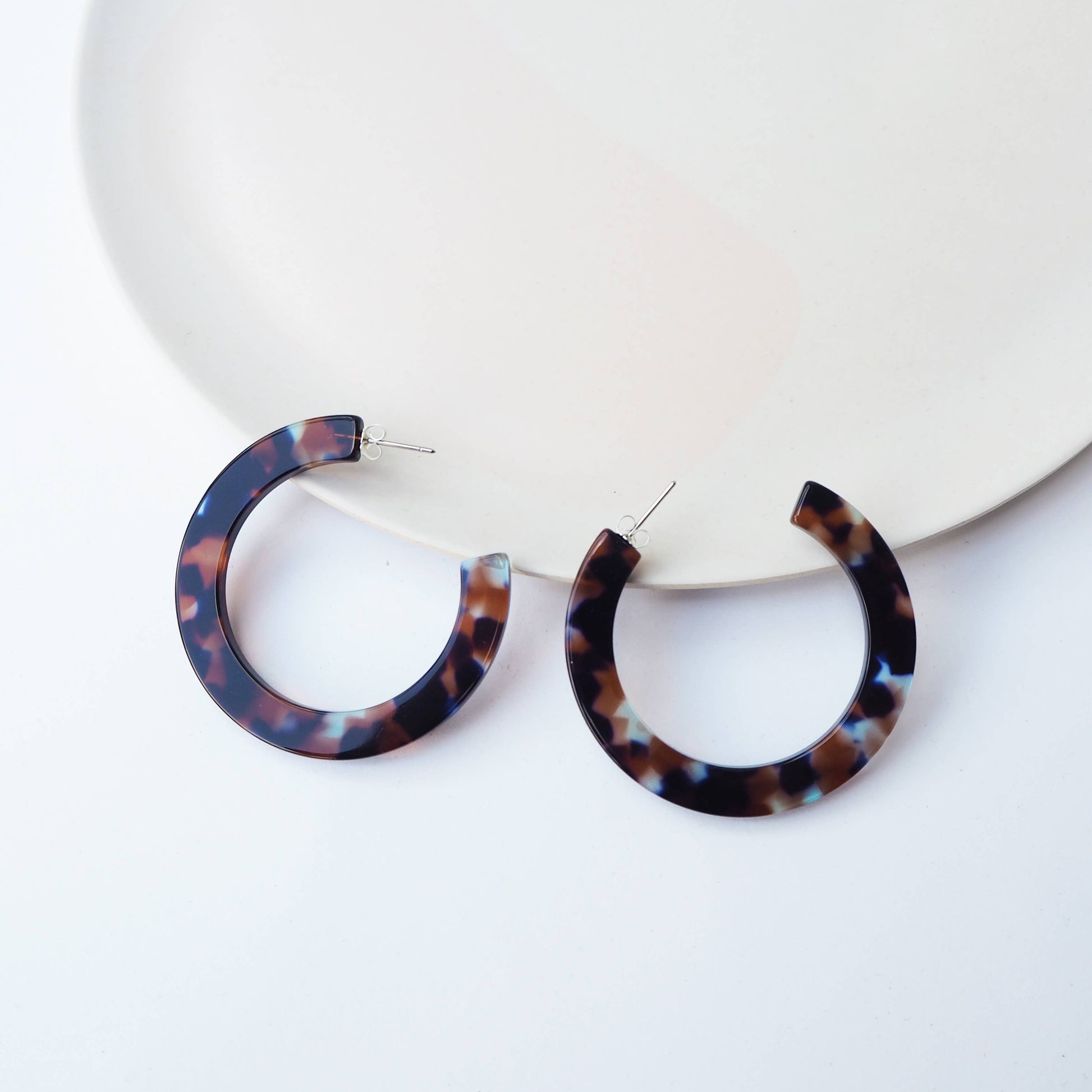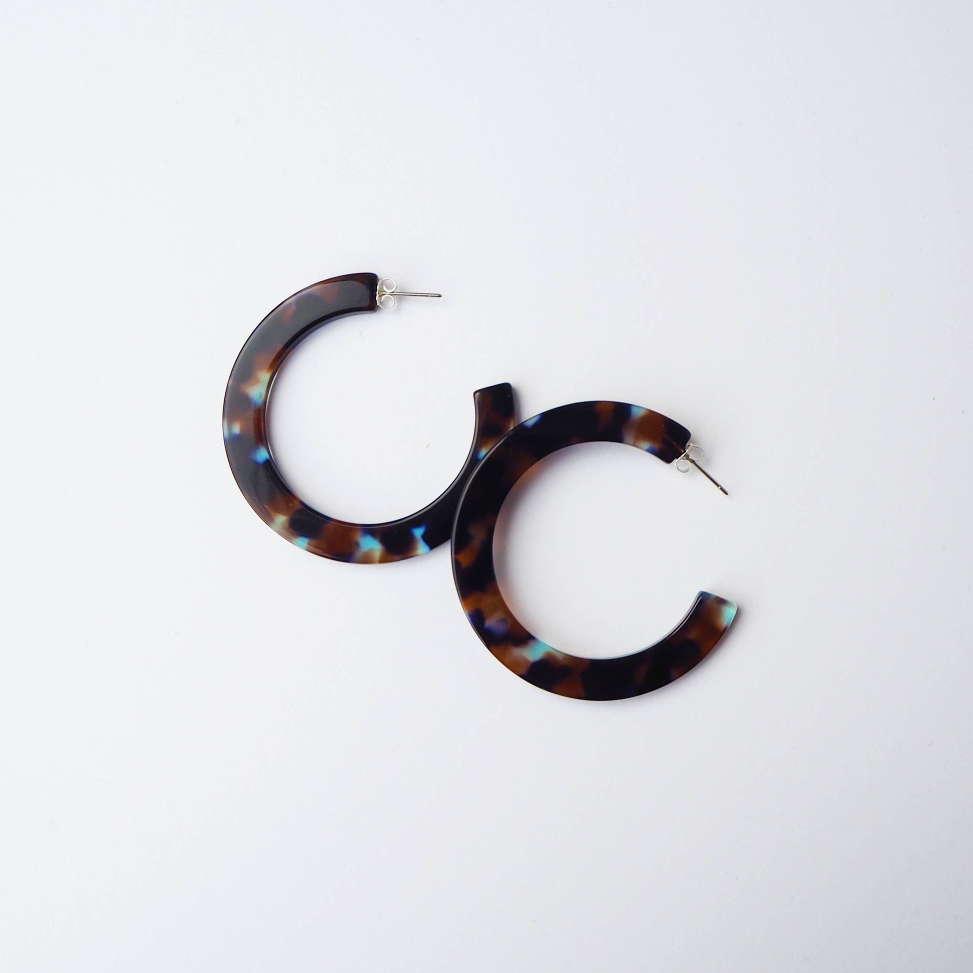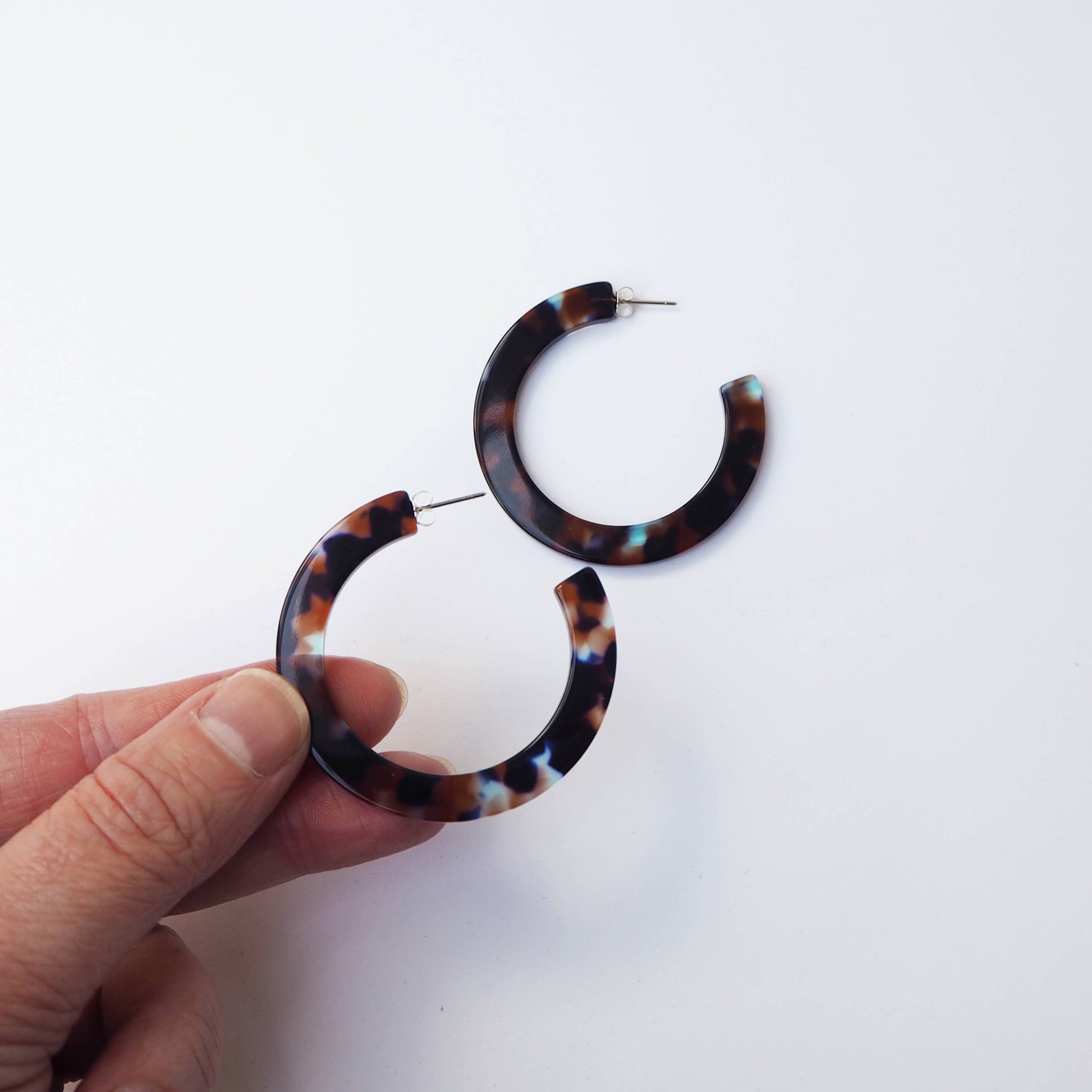 These beautiful statement sized hoop earrings are made from hand polished petroleum free cellulose acetate in a beautiful acid tortoiseshell mix which has a glass like finish. The perfect statement hoop earring.