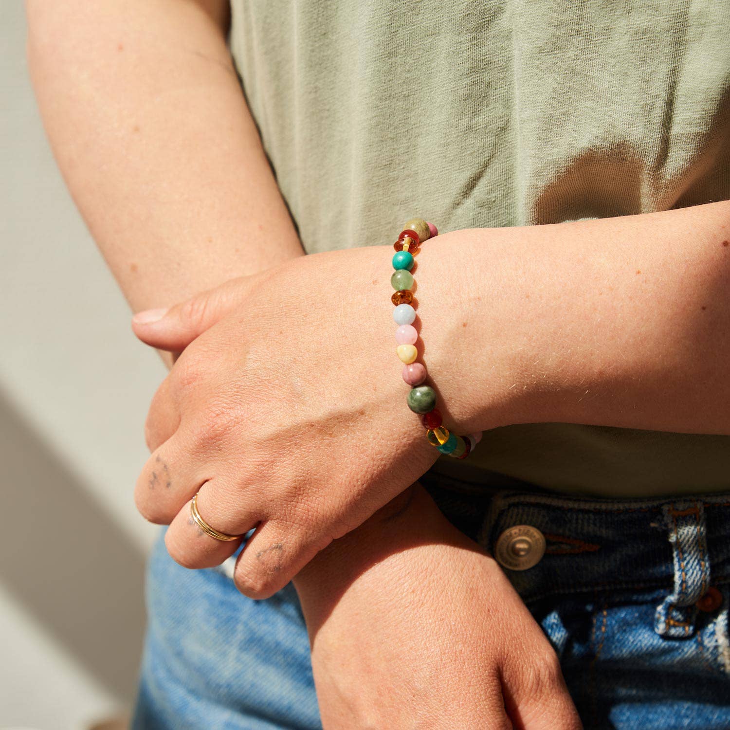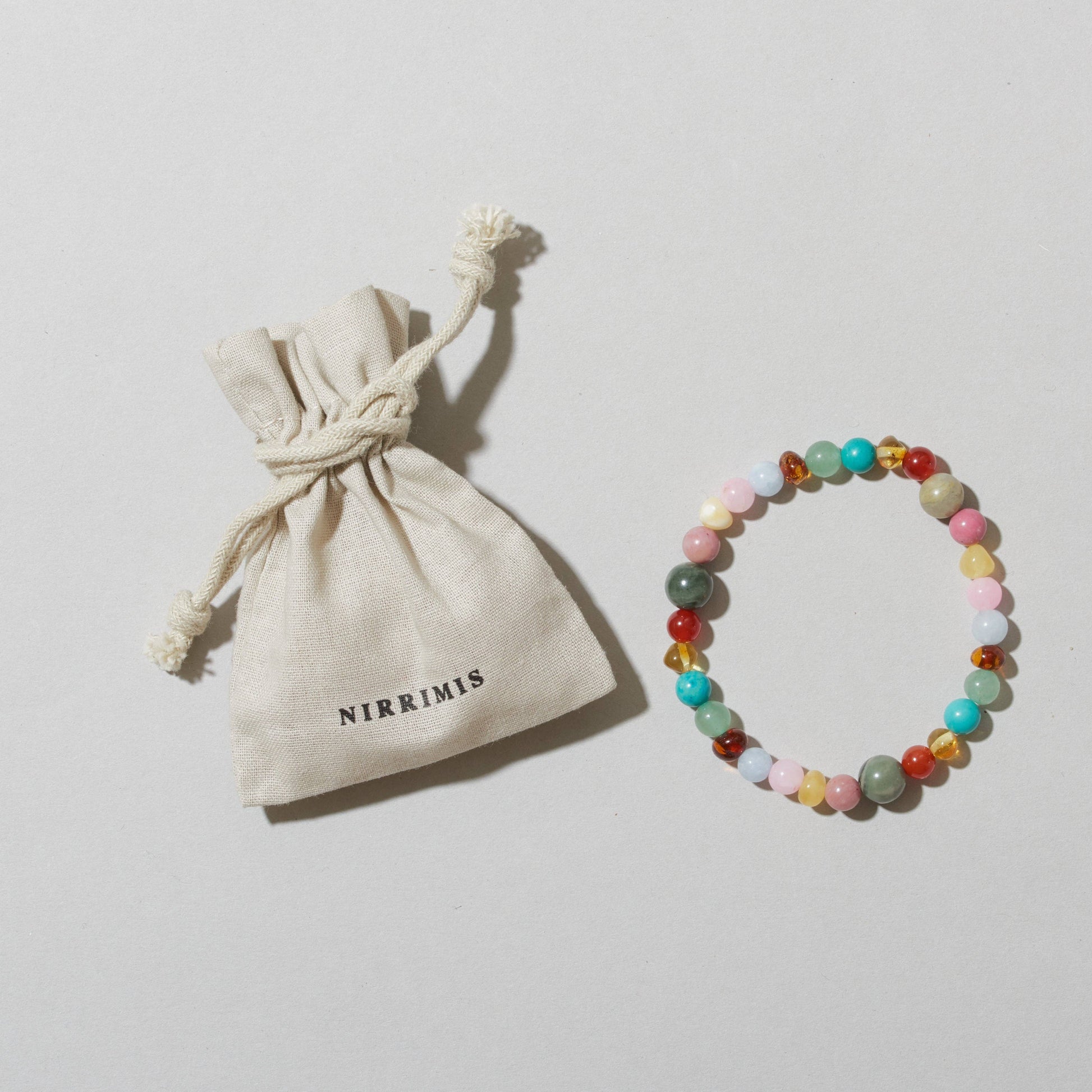 Size of bracelet 18 cm (on elastic) Material Green African Jade, Pink Jade, Green Aventurine, Carnelian, Turquoise, Aquamarine, Rhodocrosite & Amber This cool bracelet comes beautifully presented in our organic Nirrimis linen drawstring bag. Amber & Gemstones Our lab tested and ethical sourced Baltic Amber and Gemstone jewellery are handmade with love and could vary in both size and color due to the nature of the stone