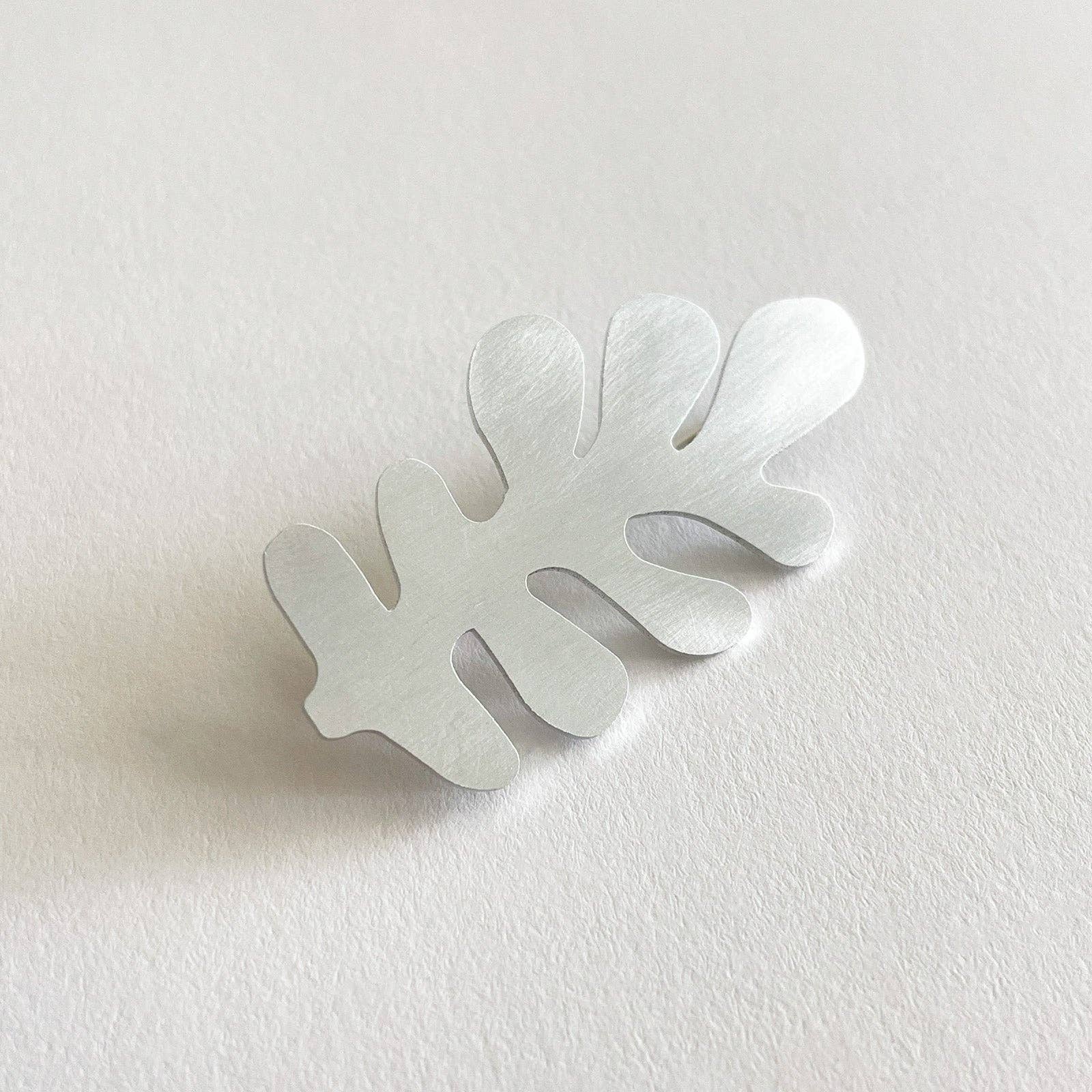 Wrack is a collection of handcrafted jewellery exploring the forms of objects and plants washed up on our shores. Crafted in hand-brushed aluminium, this pin brooch has a silver plated stick pin and protector and is presented in a beautiful gold-foiled, black sliding box. Created collaboratively between Tom Pigeon’s metal workshop in the West of Scotland and their riverside studio in Liverpool Brass pin 52mm long Silver plated pin and protector Black sliding box