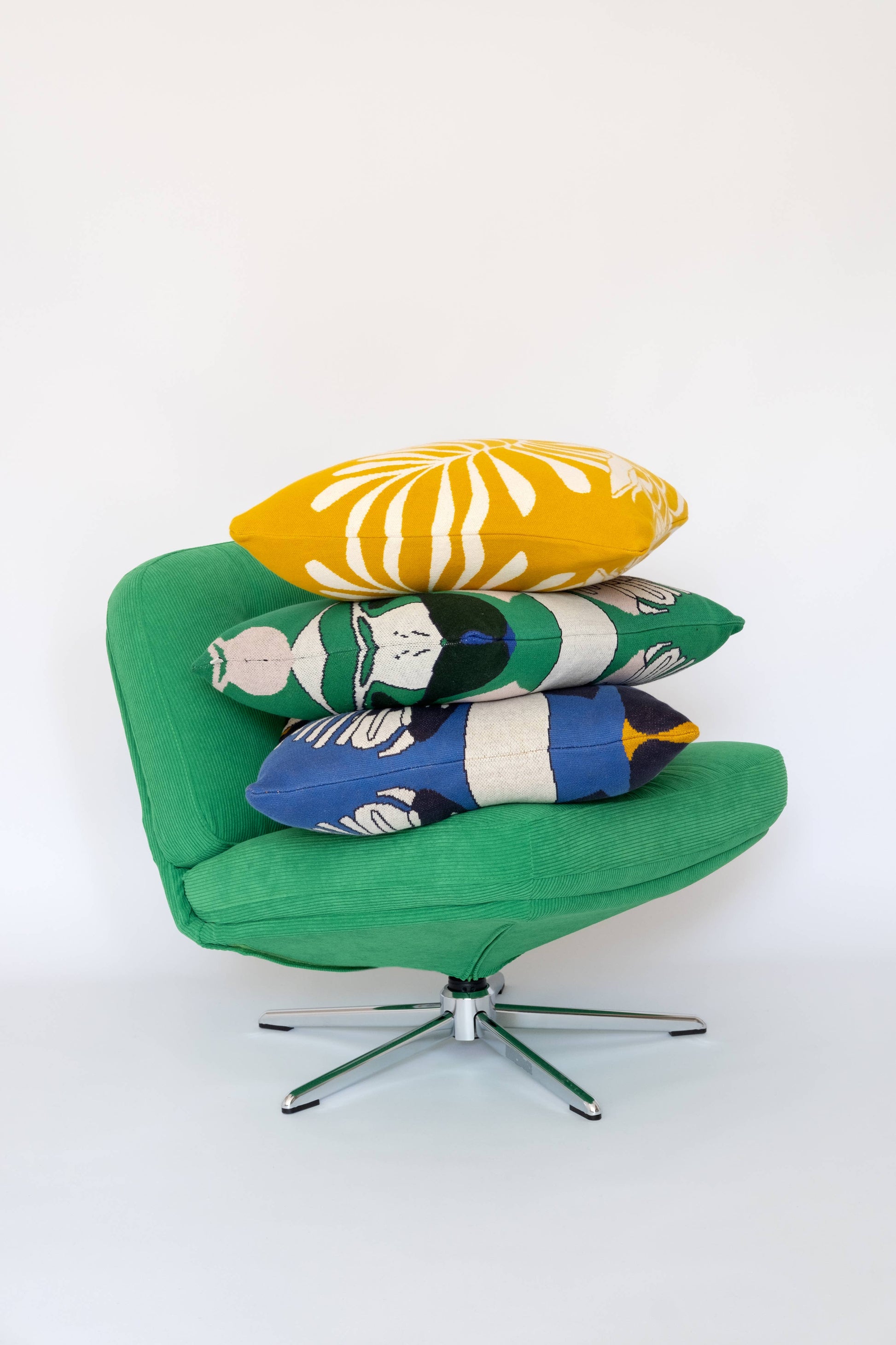 Bring bold colour and vibrant pattern into your home with this floral cotton knit cushion, featuring a striking botanical pattern in shades of bright green, deep blue, soft cream, and ink.