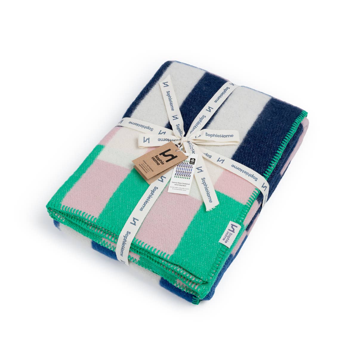 A striking geometric design, woven in premium New Zealand wool. This versatile throw adds colour and pattern to interiors with a substantial, thick and warm handle - perfect for design-led stores and style-conscious customers. Navy, cobalt, pink, green, ivory