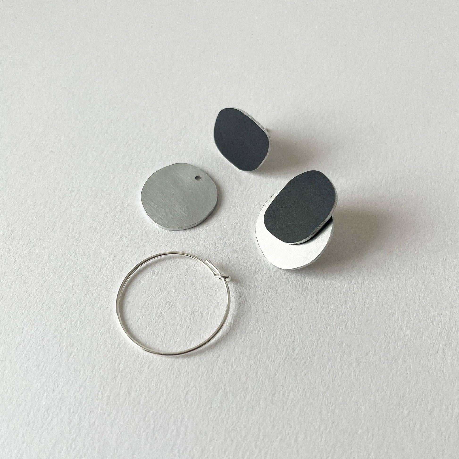 Crafted in simple brushed aluminium and matt anodised aluminium these playful Skim earrings can be worn as layers studs or taken apart and worn as smaller black studs or silver aluminium hoop drop earrings. Skim earrings have silver plated posts and hoops and are presented in a beautiful Tom Pigeon white sliding box.